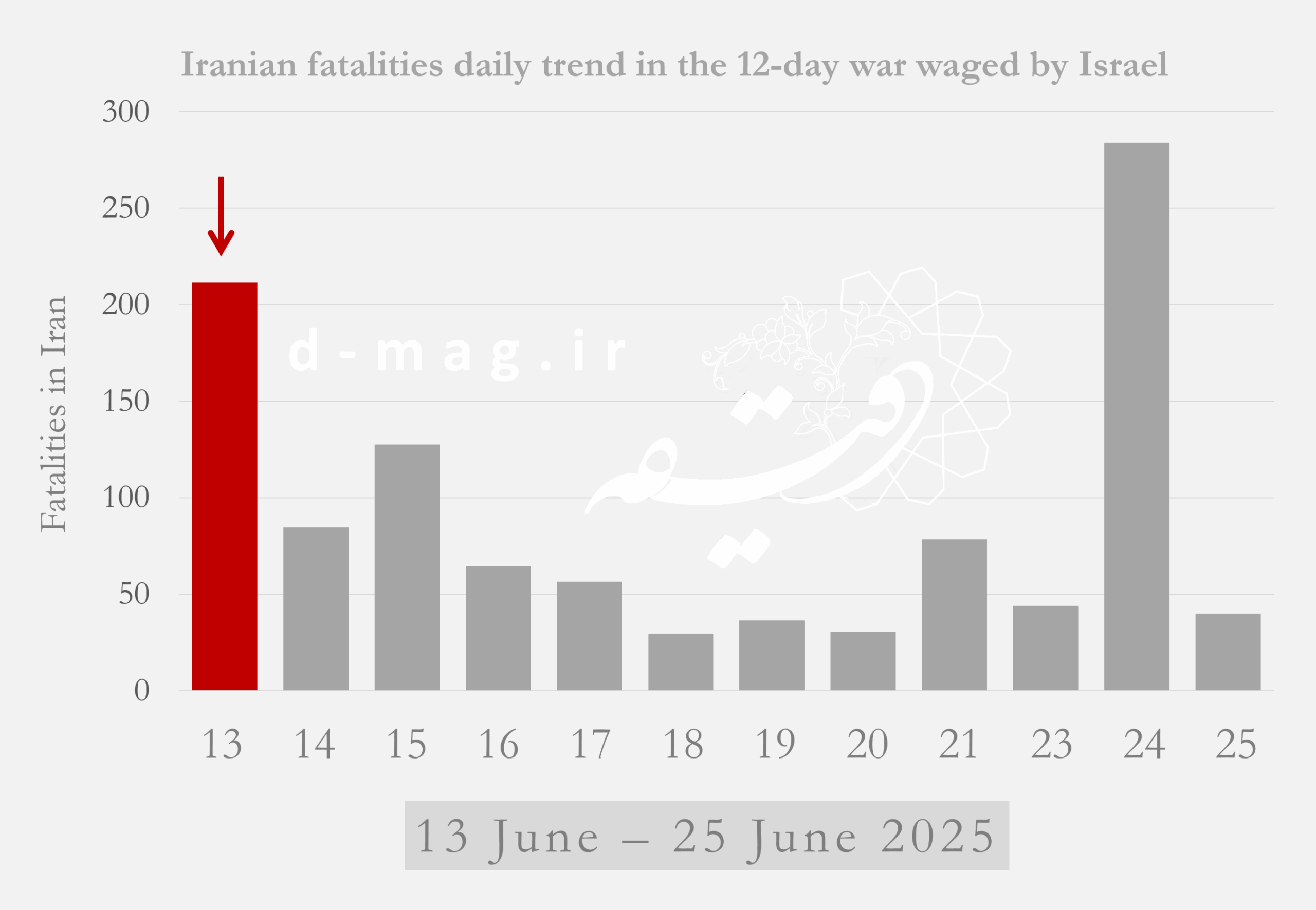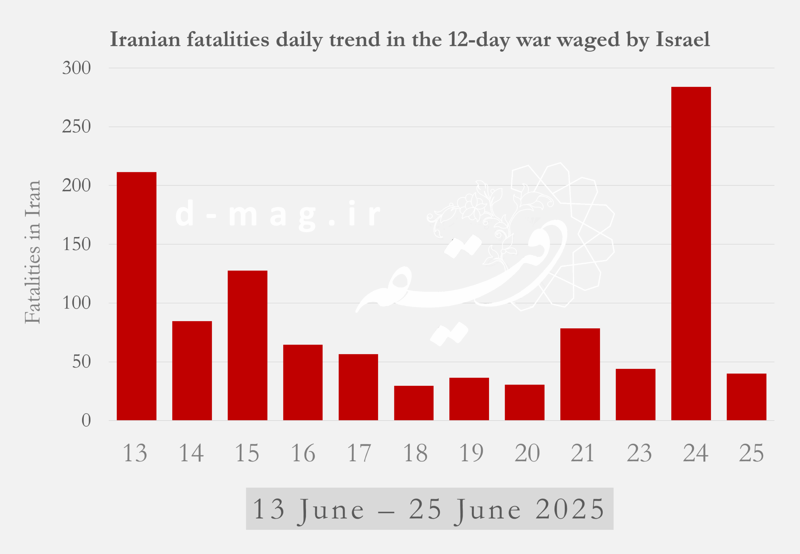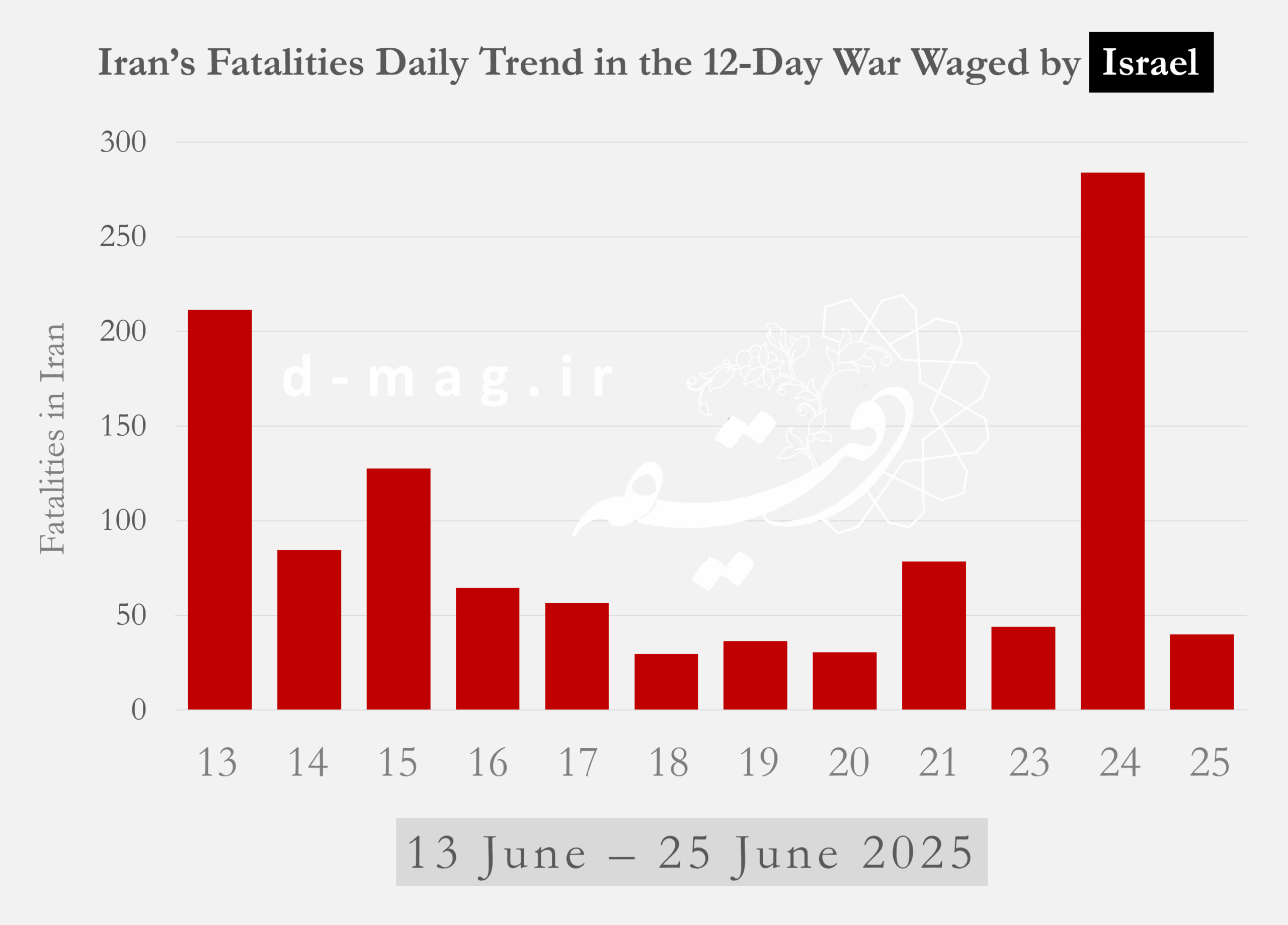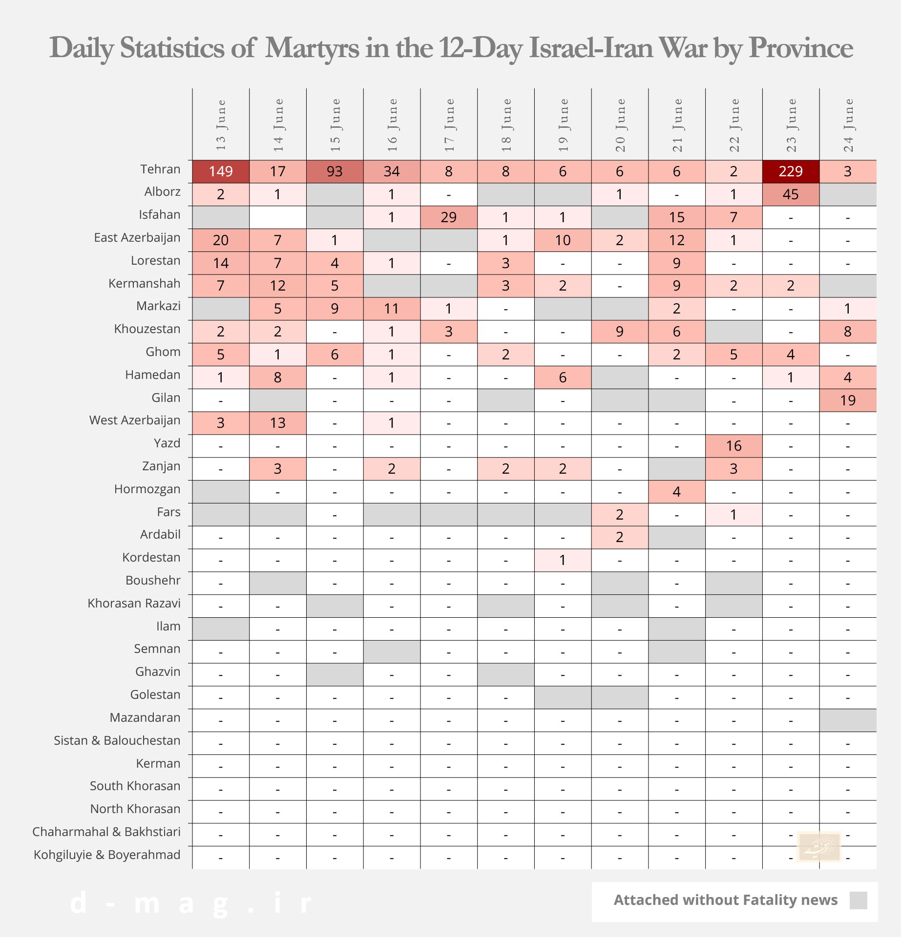 For Tehran, the bloodiest periods were the first day of the war and the final 24 hours before the ceasefire (June 12 and June 23). Other significant spikes in casualties occurred on June 13–14 in Tehran, June 16 in Isfahan, June 12 in East Azerbaijan, July 2 in Alborz, and July 3 in Gilan.