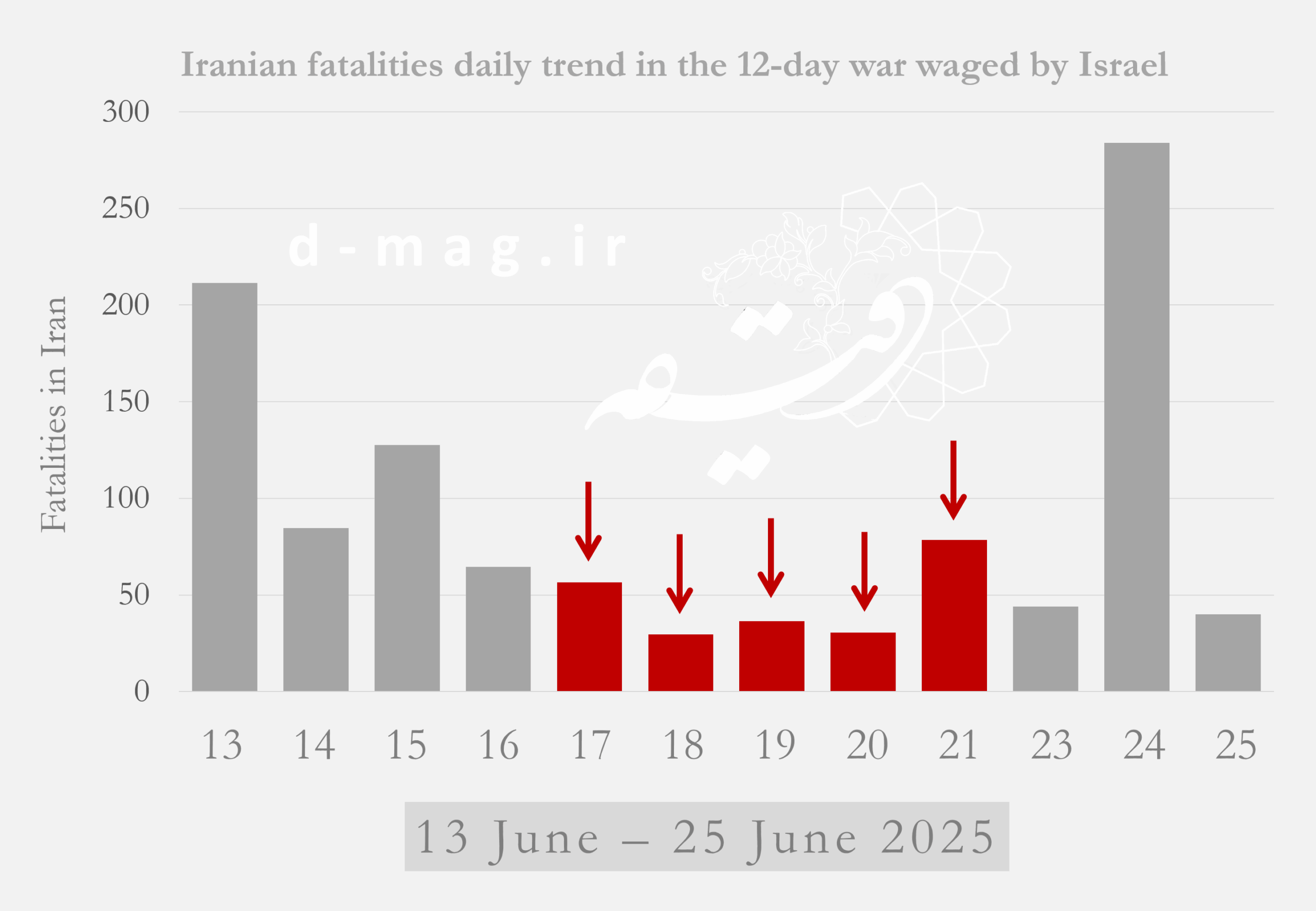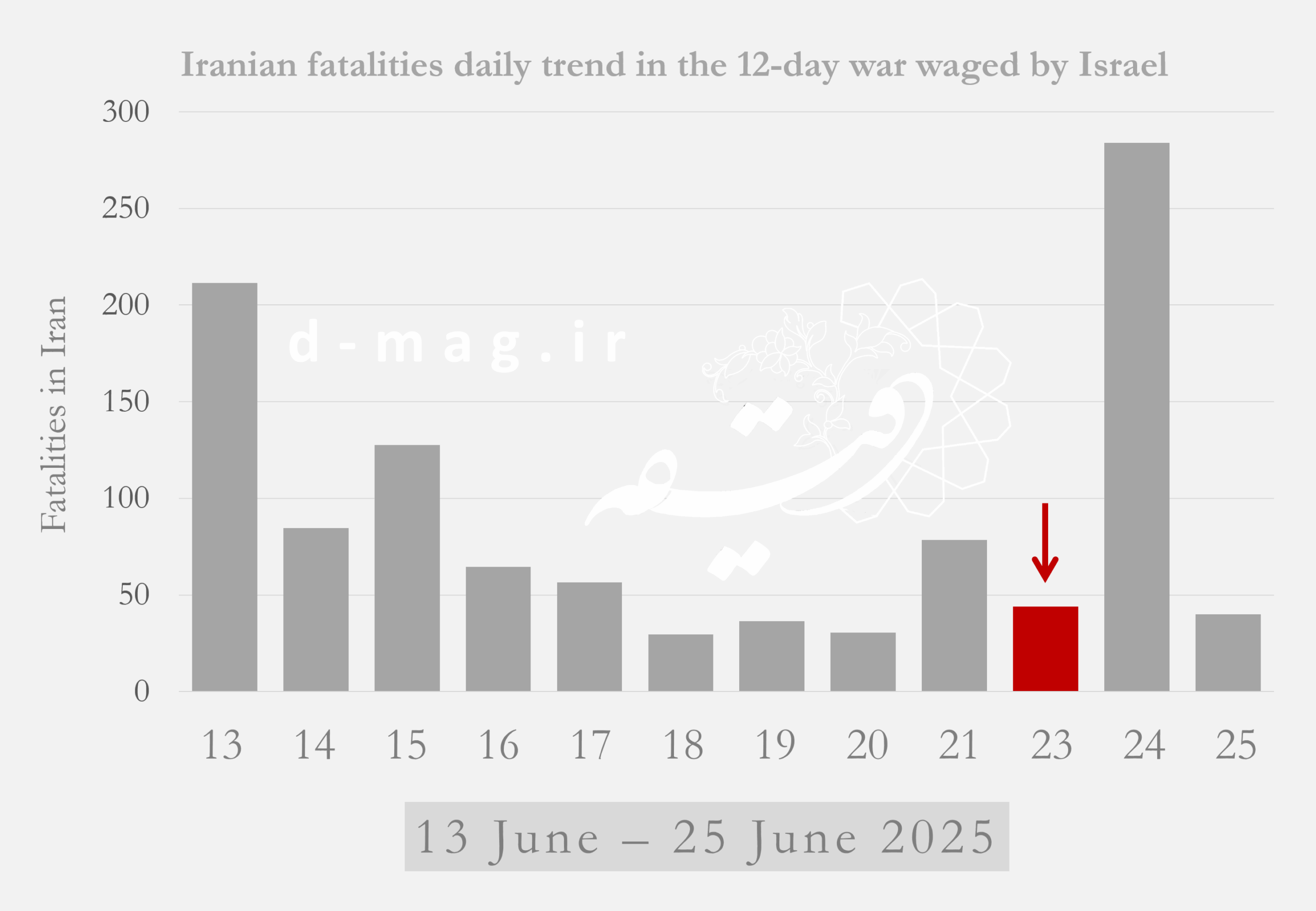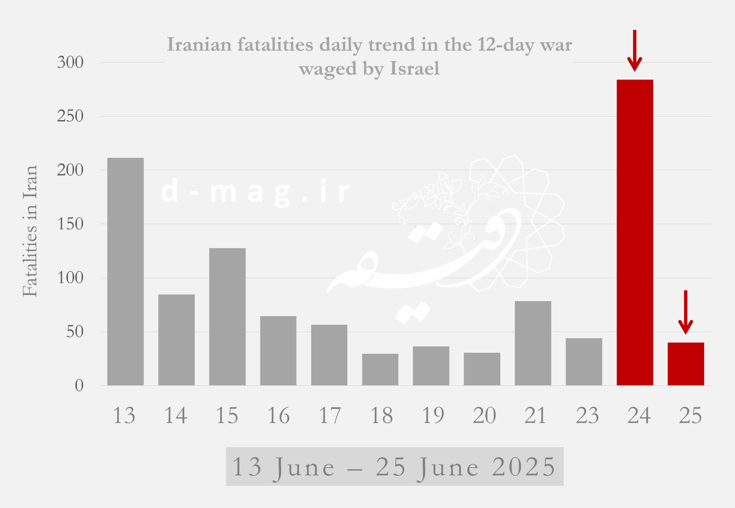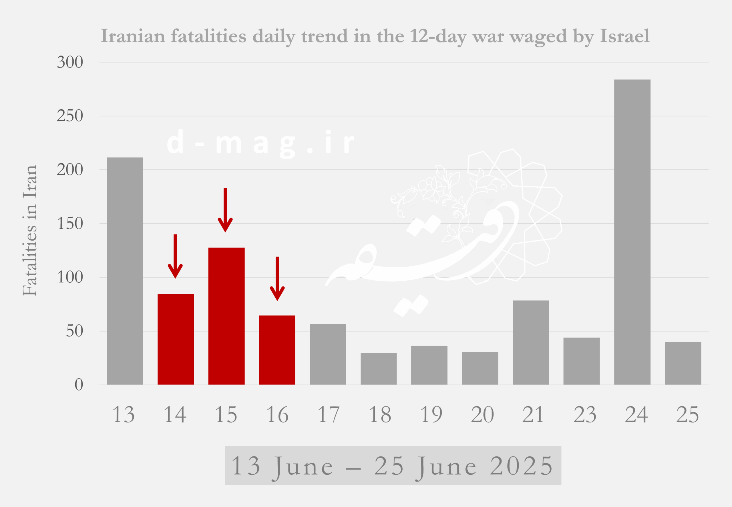 For Tehran, the bloodiest periods were the first day of the war and the final 24 hours before the ceasefire (June 12 and June 23). Other significant spikes in casualties occurred on June 13–14 in Tehran, June 16 in Isfahan, June 12 in East Azerbaijan, July 2 in Alborz, and July 3 in Gilan.