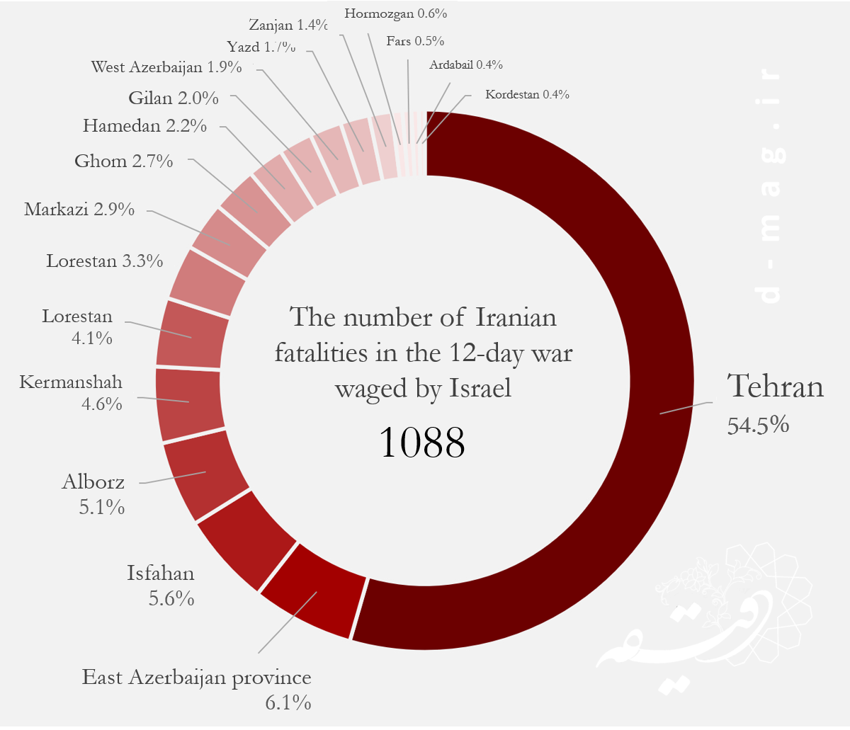 Beyond the number of the deceased, the geographical scope of Israel’s attacks on Iran is also striking. Out of Iran’s 31 provinces, 25 were targeted during the 12-day war, and 18 of them suffered casualties. Among them, Tehran—the capital and the country’s most populous city—bore the greatest share of destruction and loss, carrying much of the war’s burden. Fifty-seven percent of the martyrs (at least 592 people) were killed in Tehran, more than two-thirds of whom were non-military: civilians and law enforcement officers.
