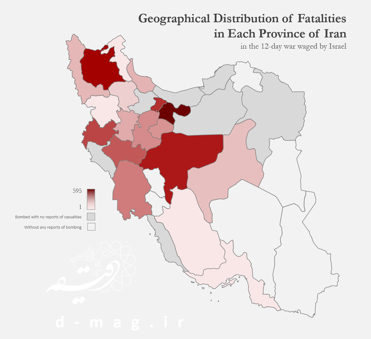Other affected provinces included East Azerbaijan, Isfahan, Alborz, Kermanshah, Lorestan, Khuzestan, Markazi, Qom, Hamedan, Gilan, West Azerbaijan, Yazd, Zanjan, Hormozgan, Fars, Ardabil, and Kurdistan. Bushehr, Ilam, Qazvin, Semnan, Mazandaran, Golestan, and Razavi Khorasan also experienced attacks during the 12-day war, though no casualties were reported in these provinces.