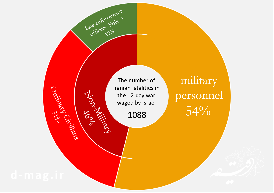 During the 8-year Iran–Iraq War, approximately 10% of the fallen were ordinary civilians. In the 12-day Israel–Iran War, despite the deployment of advanced military technology, this proportion nearly tripled to 31%. Israel, in pursuing the assassination of military commanders and nuclear experts, did not hesitate to strike residential areas, killing civilians along with their families and neighbors. The predawn assassinations on the first night in Tehran, the attack on Evin Prison, and the strike on the residential building of the Sadeghi Saber family in Astaneh Ashrafieh on the final night of the war are among the stark examples of civilian massacres during the conflict.